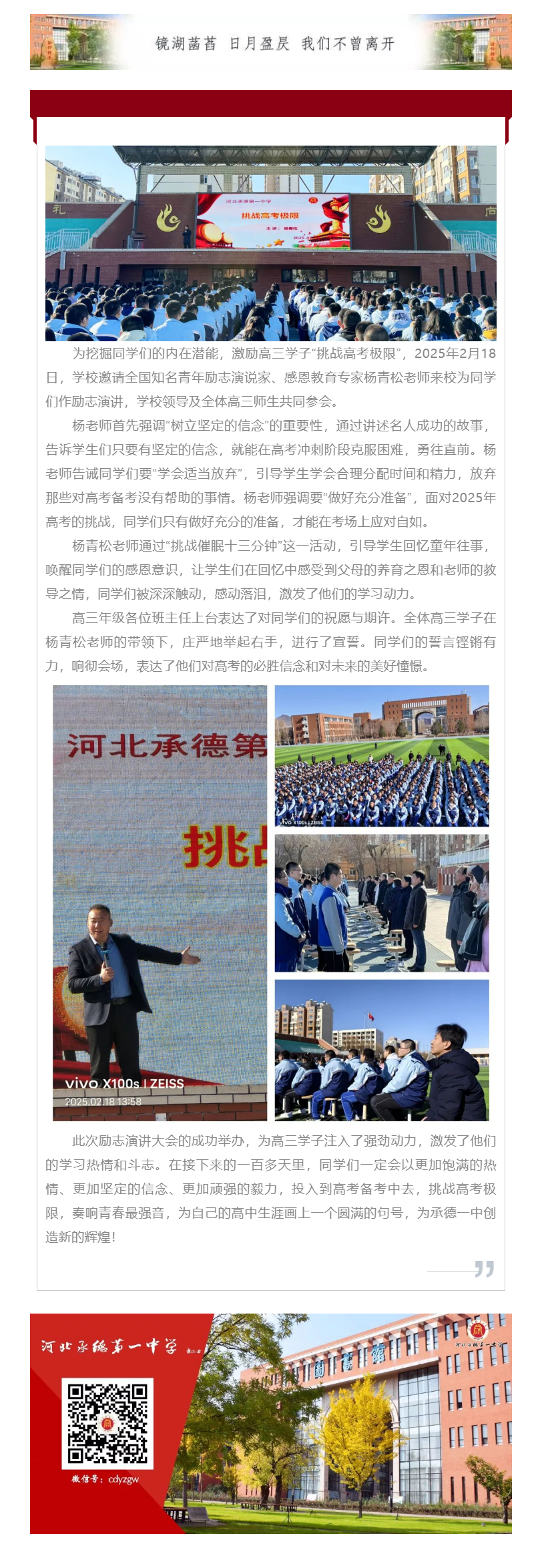 百日沖刺 挑戰極限 河北承德第一中學舉行高三年級勵志演講大會