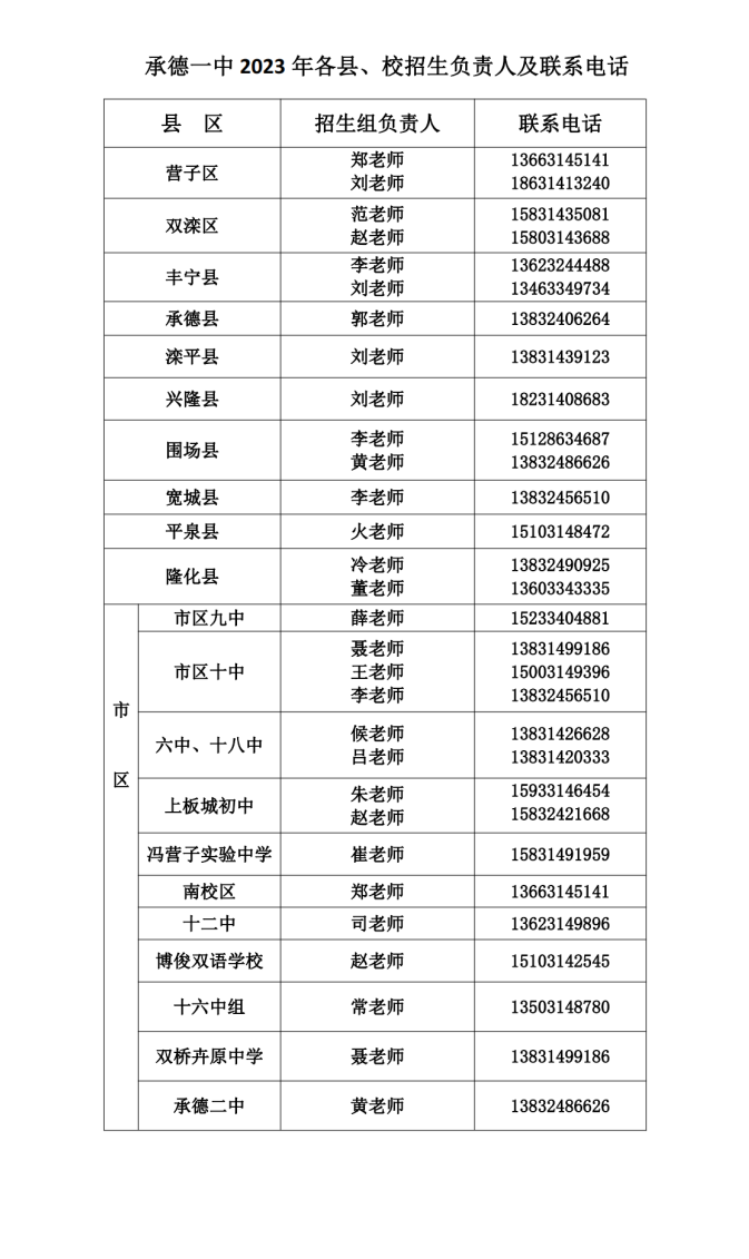承德一中2023年各縣、校招生負責人及聯(lián)系電話